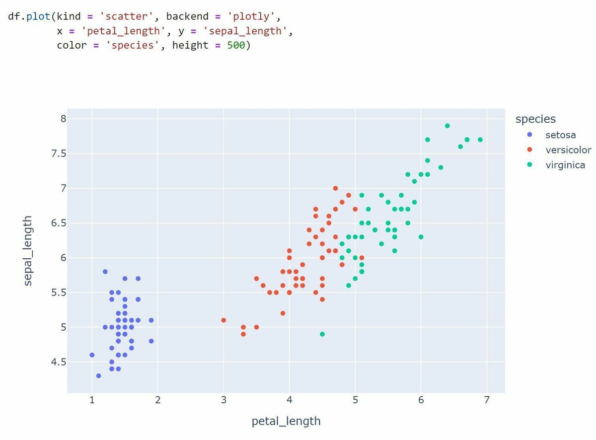 In the following example, I used the Plotly backend to create a scatter plot of the famous Iris dataset, specifically the sepal length and petal length.
